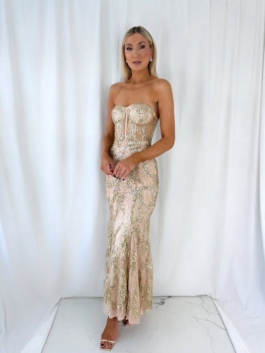 Marissa Embroidered Sheer Top Maxi Dress - Gold