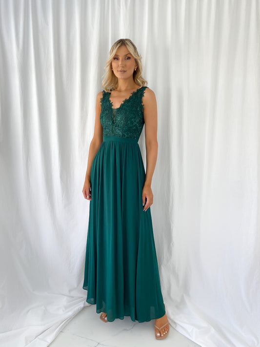 Telma Broderie Top Pleated Maxi Dress - Green