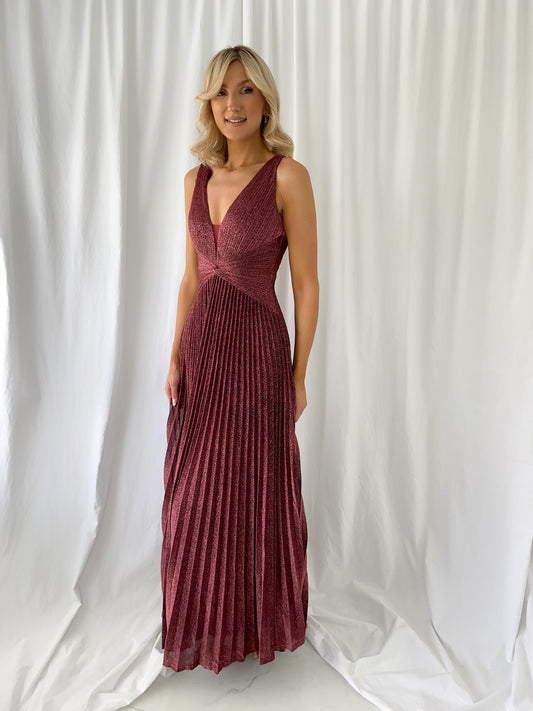 Madisson Pleated Maxi Glitter Dress - Burgundy