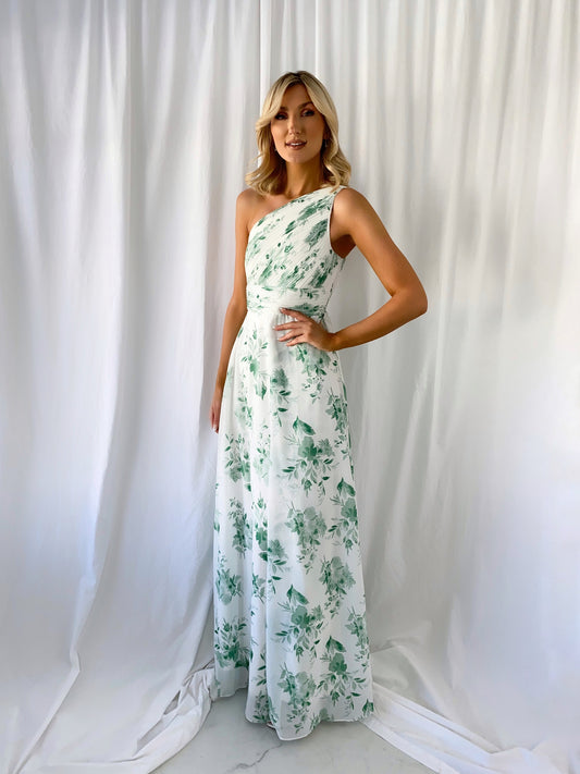 Stephanie One Shoulder Draped Top Floral Dress - Green