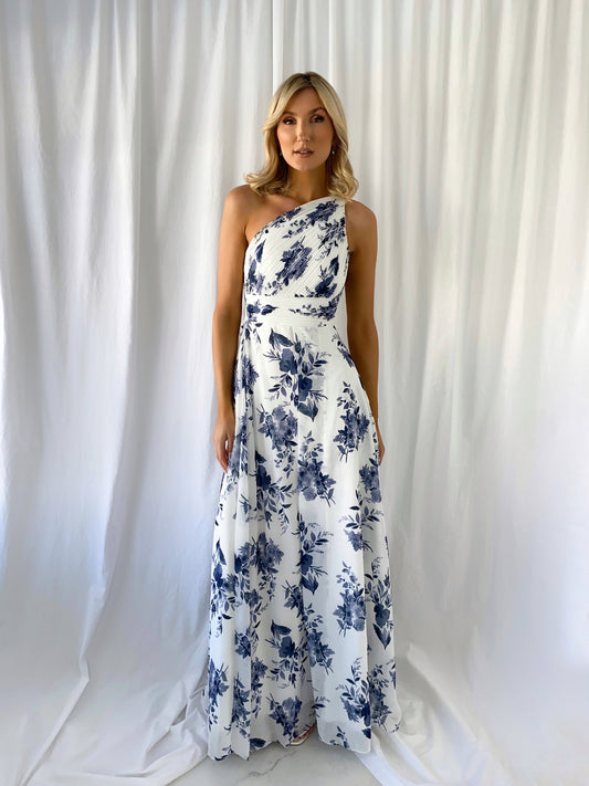 Stephanie One Shoulder Draped Top Floral Dress - Navy