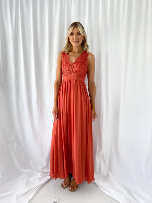 Telma Broderie Top Pleated Maxi Dress - Orange